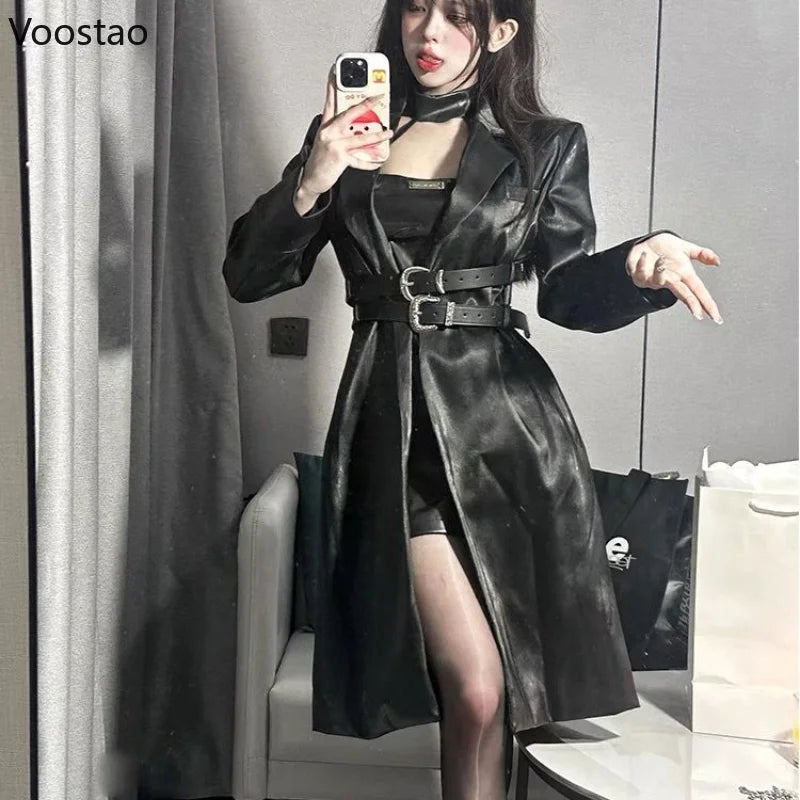 Fashion Sexy PU Leather Black Mini Dresses Set Women Casual Moto Biker Long Coat Y2k Slim Dress Suit Vintage Elegant 2 Piece Set