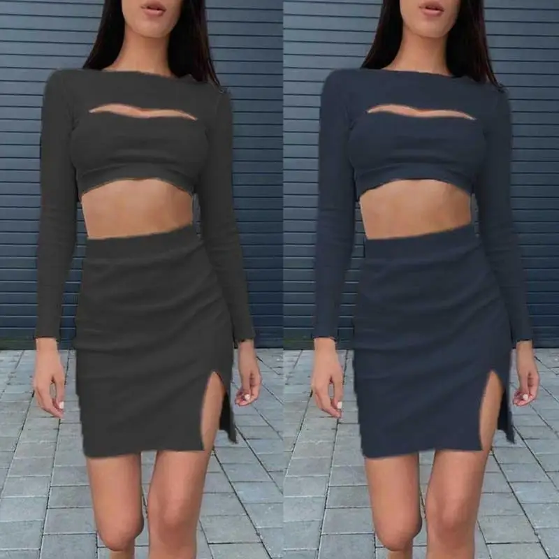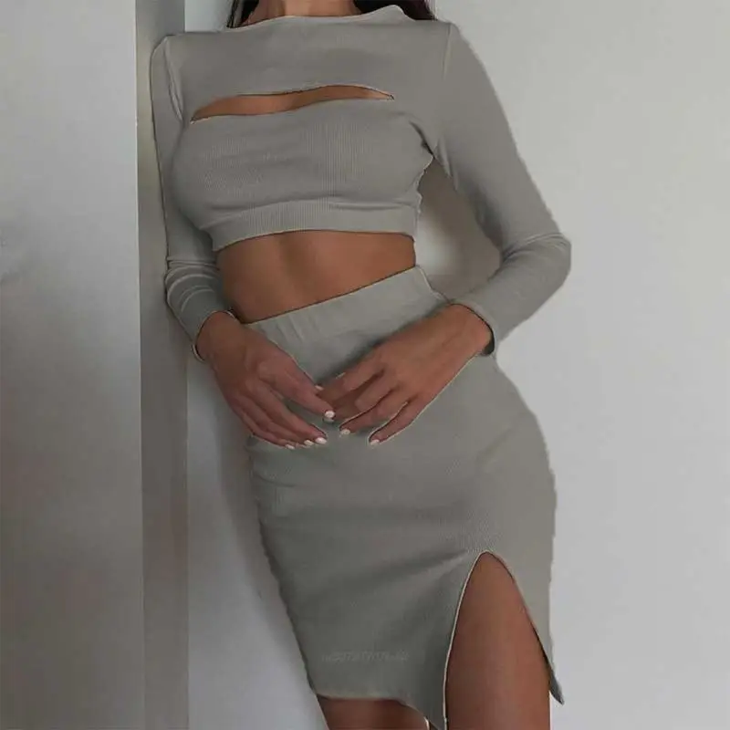 Design: hollow out long sleeve crop tops, solid color, neck tops with bodycon skirt, fit, fashionable Y2K outfit.