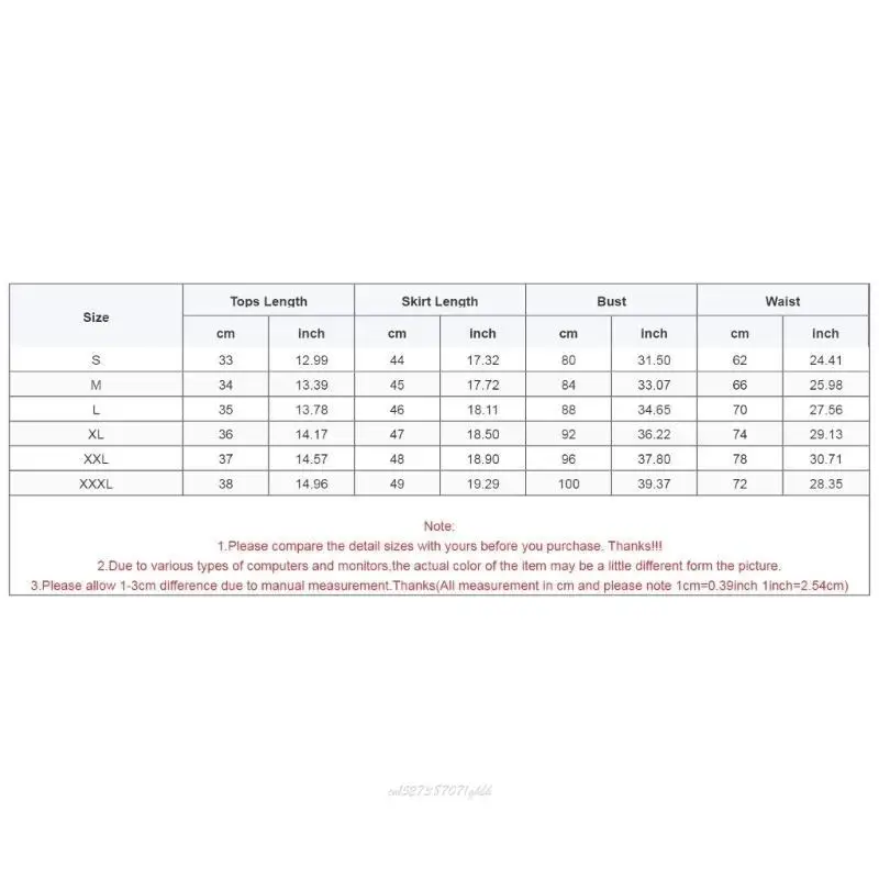 Size:XXL Tops Length:37cm(14.57inch) Skirt Length:48cm(18.90inch) Bust:96cm(37.80inch) Waist:78cm(30.71inch)